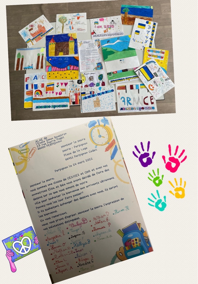 A l’initiative de Béa, animatrice de l’ALAE Boussiron, et d’Elsa en contrat pro, les CE1/CE2 ainsi qu’une classe de CM2 ont adressé à la Ville de Perpignan, des dessins représentant l’image de leur ville, Perpignan. Ces messages en couleurs sont destinés aux enfants qui arrivent d’Ukraine. Un petit clin d’œil pour les accueillir en leur souhaitant la bienvenue « ласкаво просимо »