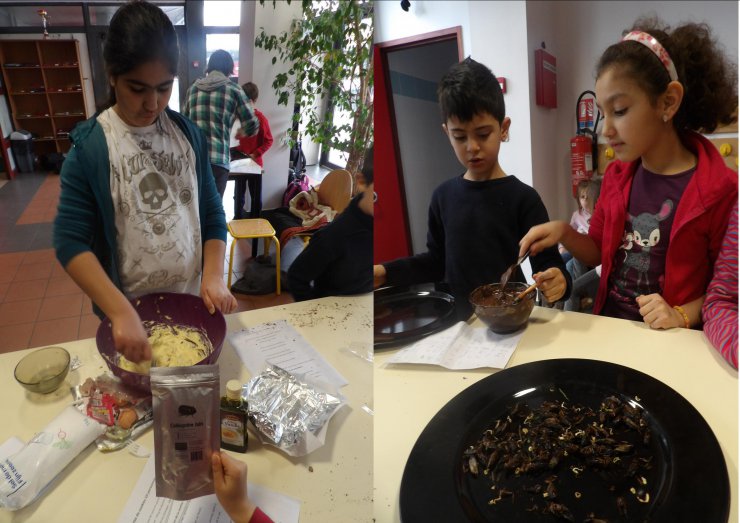 Pour faire le plein de protéines, les enfants de l’accueil de loisirs Jordi Barre ont cuisiné… Des insectes ! Alexis, animateur à la ligue de l’enseignement, mène cette activité lors des nouveaux Temps d’Accueil Périscolaire (TAP). Au menu ce vendredi après-midi : Cookies aux grillons et bonbons de chocolat aux coléoptères ! La semaine prochaine les entomologistes en herbe construiront un hôtel à insectes.