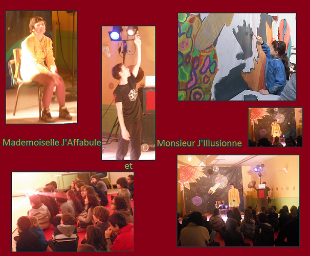 Le succès du marché de Noël, a permis à l’ALAE de Square Platanes de financer un spectacle, qui a eu lieu le jeudi 09 février 2012. Cette pièce, Mademoiselle J’Affabule et Monsieur J’Illusionne de la compagnie Gerard Gerard, a été proposée par une ancienne animatrice de Square Platane, Muriel Sapinho. Elle proposa également que les enfants fassent partie intégrante de la réalisation du spectacle en confectionnant les décors de la pièce. Le travail des enfants sera d’autant plus mis en valeur, étant donné qu’ils vont servir durant toutes les représentations de cette pièce. Cette valorisation est méritée étant donné le gros travail fournit en amont, dans l’élaboration du décor, dans le choix des motifs, des couleurs etc ...