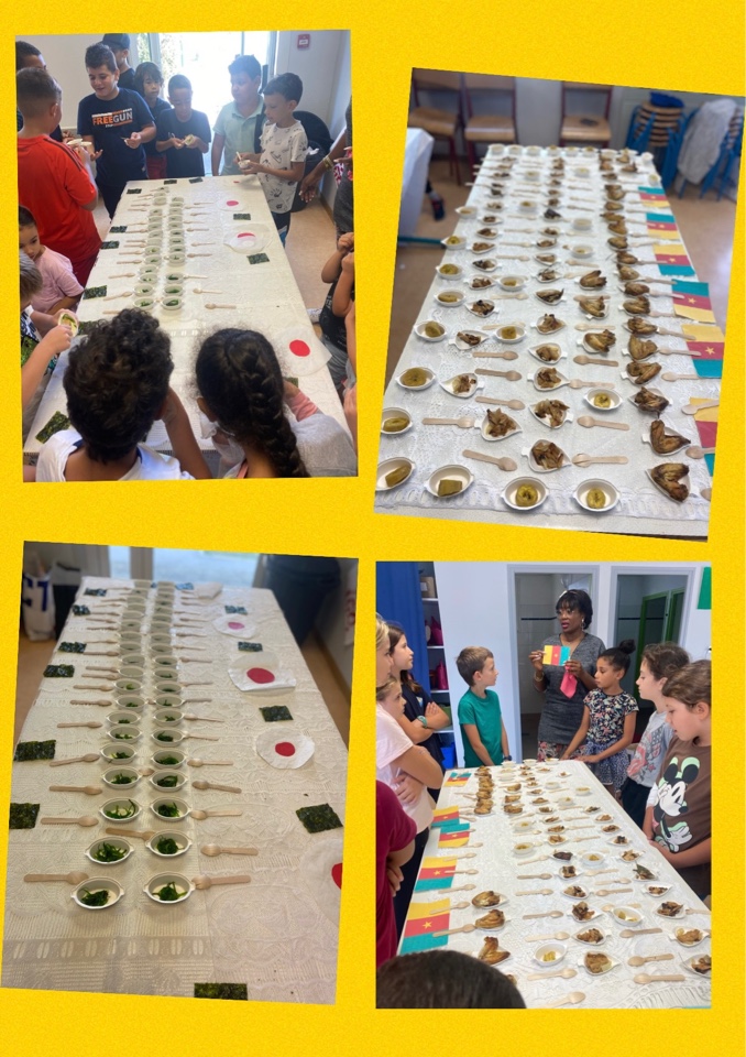 Ina, une animatrice nous fait découvrir 1 pays chaque jour. Aujourd’hui c’est confection et dégustation de plats typiques : algues fraîches et algues séchées venues du Japon, Poulet DG du Cameroun, un vrai régal. De quoi voyager tout en réveillant les papilles !