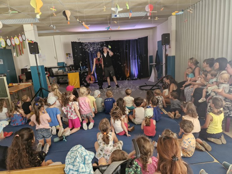 Pour clore cette belle année de découvertes, de jeux et de complicité, un spectacle féérique a été offert aux enfants : un moment magique de bulles de savon présenté par Alberto Merletti & Cristina. Le duo a su émerveiller petits et grands avec poésie, humour et légèreté.