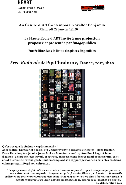 Le Centre d'Art Contemporain "Walter Benjamin", propose sa première programmation filmique, réalisée en collaboration par la Haute Ecole d'Art et imagopublica. Le film "Free Radicals" de Pip Chodorov sera projeté.